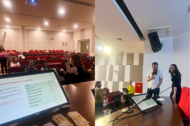 Across three rounds—representing Year 1, Year 3, and Year 5—plus a few unexpected curveballs from the European Commission, each team was ultimately required to pitch their strategy to the room. Teams that explored the full range of exploitation and engagement options were consistently rewarded, showing how a diversified and proactive approach can significantly increase the long-term value of research outputs.